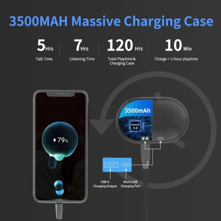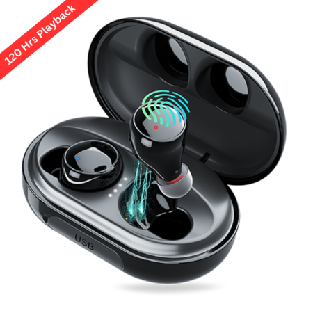 • 120H Playtime: The wireless Bluetooth earbuds deliver 6H listening time and 5hrs talk time on single charge, total 120hrs playtime with massive 3500 MAH charging case.